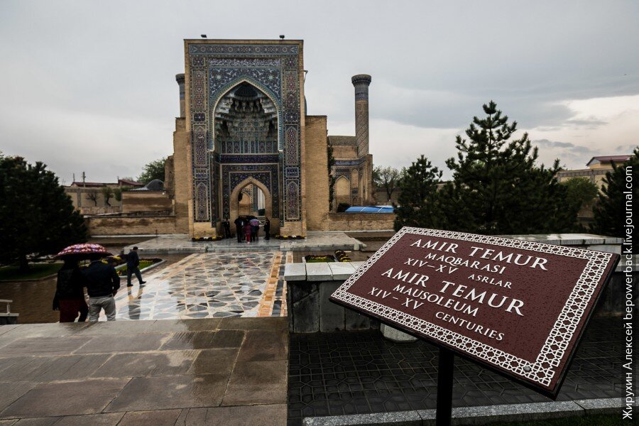 Перед входом в мавзолей находятся остатки каменного трона Тамерлана и каменная чаша, из которой его воины перед походом пили гранатовый сок. По легенде, он наделял их сказочной силой.