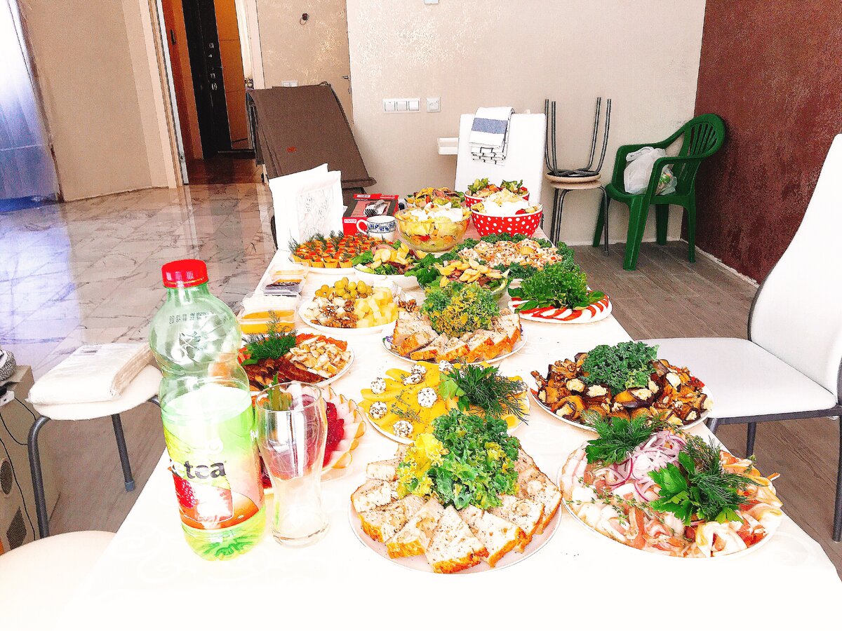 Вот такой замечательный стол мы приготовили нашим клиентам на новоселье в таунхаусе в посёлке Загорянский. Помимо основного стола, мы готовили ещё и горячее на американском гриле. На основной стол мы подготовили: - террин из курицы с шампиньонами и фисташками - рулетики из баклажанов с грузинской начинкой - тарталетки с красной икрой и крем чиз - мясное ассорти - сырное плато - салат «капрезе» с рукколой - цезарь с курицей - салат с ростбифом На горячее мы подали: - овощи гриль с красной рыбой в апельсиновом-медовом маринаде - медальоны из мраморной говядины с картофельными дольками, розмарином и чесноком - курицу в корочке из грузинских специй с помидорами на углях Заказчики очень были довольны таким столом и теперь постоянно приглашают нас на свои праздники. А так же порекомендовали нас своим друзьям. Мы очень рады, когда все что мы творим нравится Вам и с большим удовольствием дарим скидки на наши услуги при повторных заказах. А так же мы постоянно стараемся удивлять новыми блюдам