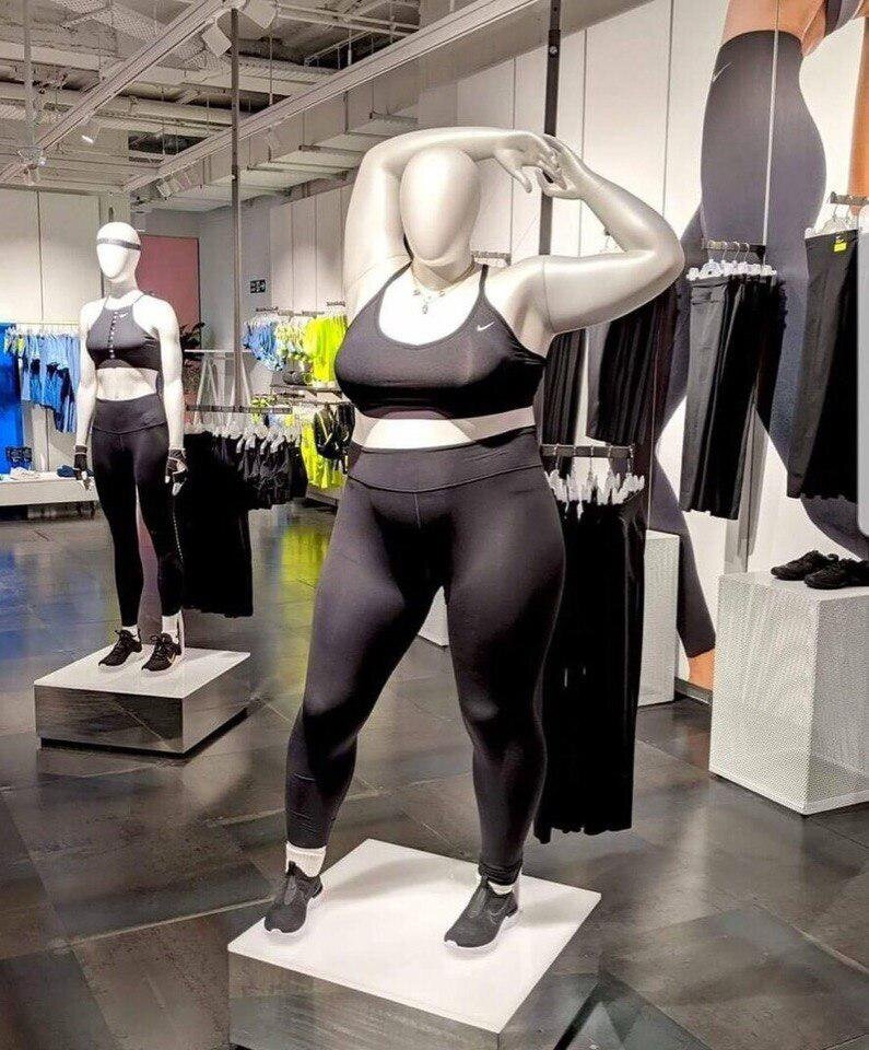 Маркетологи заявляют, что полным людям очень сложно найти себе подходящую одежду или угадать, как будут на их теле смотреться спортивные вещи. Поэтому они решили разместить для «пышек» специальные манекены, но почему тогда это не свободный, просторный крой, зачем опять эти лосины, которые затягивают тебя и выпячивают все огрехи твоей фигуры.