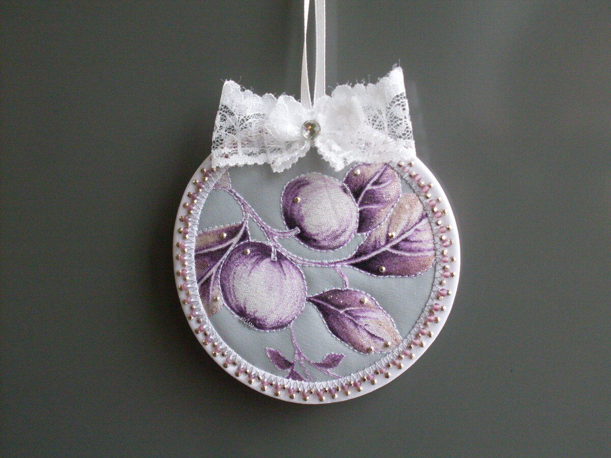 Доброго времени, дорогие рукодельницы и все, им симпатизирующие! Сегодня я хочу поделиться с Вами мастер-классом по изготовлению ёлочной игрушки с секретом. Каким? Читаем ниже!) Для её изготовления нужны: 1. Светоотражающая лента; 2. Прокламелин; 3. Синтепон; 4. Органза с цветочным рисунком; 5. Кристаллон (ткань); 6. Нитки для шитья; 7. Косая бейка белого цвета; 8. Маленькие стразы; 9. Бисер сиреневого цвета; 10. Белое кружево; 11. Узкая белая лента; 12. Широкая белая лента; 13. Клей «Момент кристалл»; 14. Швейная машинка; 15. Ножницы; 16. Циркуль; 17. Игла для ручных работ; 18. Простой карандаш; 19. Краски акриловые; 20. Кисть; 21. Серебряный люрекс. Первое, что мы сделаем — подготовим фон-подложку для будущей игрушки. Возьмём светоотражающую ленту шириной 5 см. Отрежем от неё 2 кусочка, длиной по 10 см каждый. Наложим оба отрезка ленты изнаночной стороной на кусочек флизелина или прокламелина, стык в стык продольными сторонами, и приклеим при помощи утюга. Затем приступим к декориро