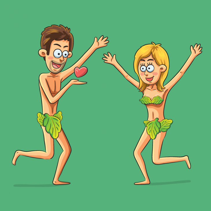 Адам с Евой резвятся в саду, спускается к ним Бог и говорит:
