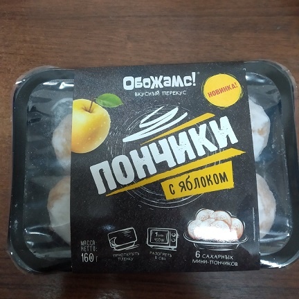 Пончики с яблочной начинкой, готовый продукт, который нужно всего лишь разогреть в микроволновой печи в течении 1-ой минуты. Но можно кушать не разогревая, разморозив до комнатной температуры.