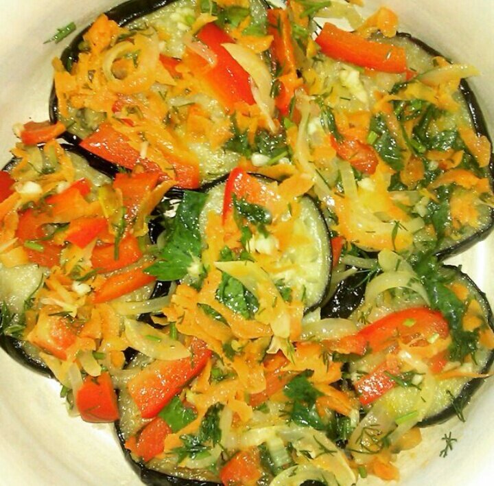 Состав: Баклажаны – 4 больших Перец болгарский красный (разноцветный) - 3 штуки Морковь – 3 средних Лук репчатый – 3 средних Чеснок – 1 небольшая головка Зелень – кинза, петрушка, укроп (по 1 пучку каждого) Маринад: Уксус 9% - 1/2 стакана Сахар – 1/2 стакана Вода – чуть больше 1/2 стакана Соль Масло для жарки Приготовление: Все овощи помыть, с баклажан срезать пложоножки, перец очистить от семян, морковь и лук очистить. Баклажаны порезать на кружочки толщиной 1,5 см. Или просто толстые кружочки. Посолить и оставить на 1 час для выделения сока и устранения горечи. Просушить бумажным полотенцем и пожарить на сковороде с маслом. Перец порезать ломтиками чуть крупнее сантиметра, лук крупноватыми полукольцами (или перьями). Морковь натереть на крупной тёрке. Лук, морковь и перец немного поджарить на сковороде с маслом, но так, чтобы овощи слегка подхрустывали. НЕ нужно зажаривать!!! В самом конце добавить в овощи чеснок, давленный через крупный пресс и нарубленную зелень. В гл