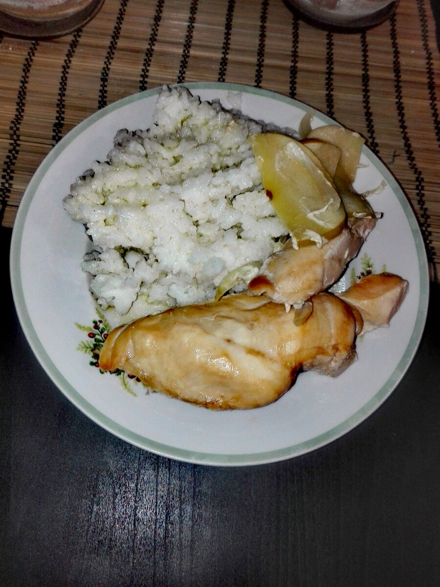 Разрезаем яблоко пополам, удаляем сердцевину, и нарезаем полукольцами. Затем укладываем нарезанное яблоко между кусочками курицы. ⠀Сверху накрываем фольгой, и убераем в разогретую до 180 °C духовку, на 30 мин.