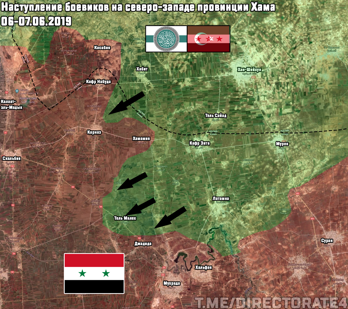 Впрочем, речь идёт уже, скорее, не о «вылазках», а чём-то более серьёзном. Так, ответом на освобождение при участии «ТилТигра» Сухейля аль-Хасана Эль-Кесабии стало наступление противника на северо-западе провинции Хама. По информации Directorate4, вечером 6 июня объединенные силы боевиков запрещённых в России группировок «Хайат Тахрир Аш-Шам», протурецких «Джабхат Ватания Тахрир», «Джейш Али бин Аби-Талиб» и других после артиллерийской подготовки начали наступление на фронте юго-восточнее Кафр-Набуда. Основным направлением удара был избран район поселения Тель-Малах, с находящейся там одной из важных высот. Боевикам удалось завладеть участком дороги и тремя небольшими сёлами (Аль-Джабайн, Тель-Малах и Кафр-Яхуд), которые сирийские части пытаются отбить. Также они атакуют в направлении городка Карназ в пяти километрах южнее Кафр Набуды. Цель операции – закрепление на позициях к югу от Хабита с тем, чтобы удержать и его, и Хан-Шейхун – следующий за Хабитом важный опорный пункт террористов.