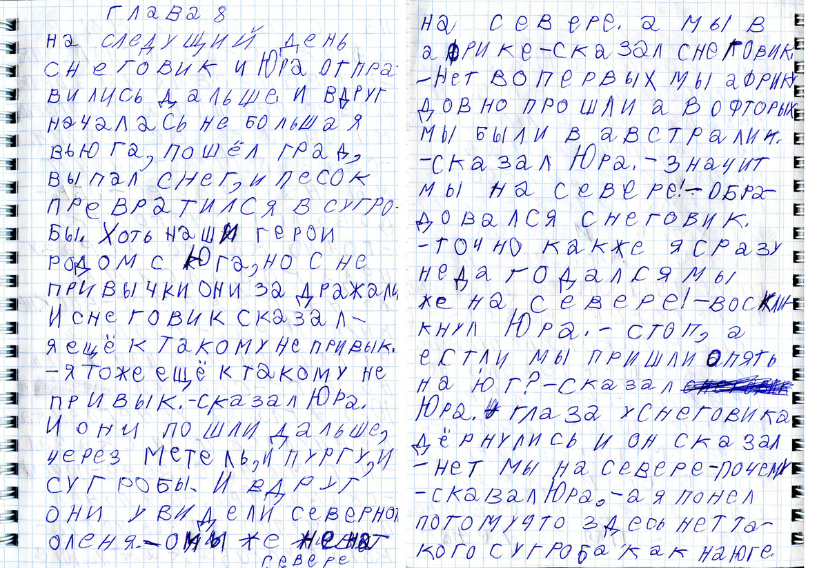 <- Глава первая ... <- Глава седьмая <- Глава восьмая: На следующий день Снеговик и Юра отправились дальше и, вдруг, началась небольшая вьюга, пошёл град, выпал снег и песок превратился в сугробы. Хоть наши герои родом с Юга, но с непривычки они задрожали. И Снеговик сказал — я ещё к такому не привык. — Я тоже ещё к такому не привык — сказал Юра. И они пошли дальше через метель, и пургу, и сугробы. И, вдруг, они увидели северного оленя. — Они же живут на Севере, а мы в Африке — сказал Снеговик.