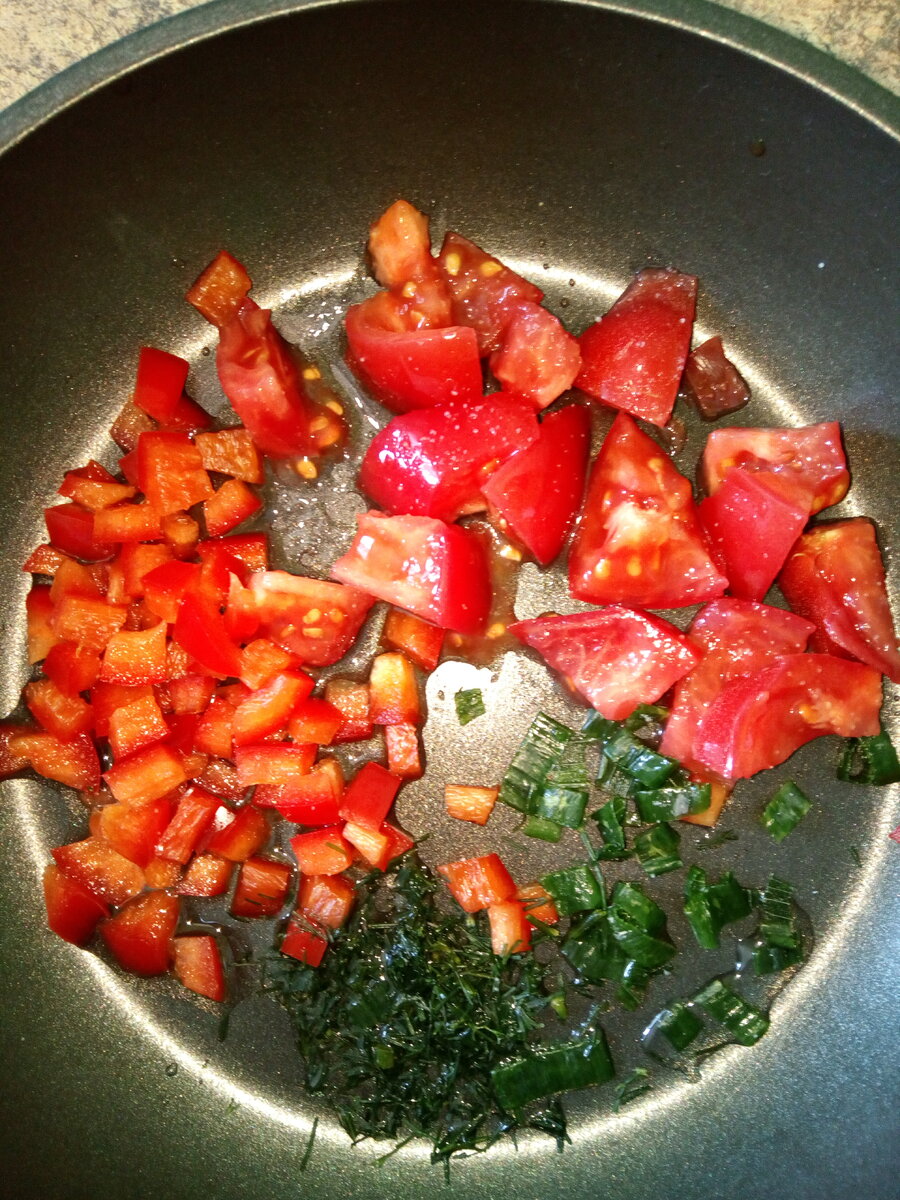 Здравствуйте, друзья! Мой быстрый обед на сегодня - яичница с овощами и сухариками! Ингредиенты: 1. 2 яйца. 2. Овощи (помидор, красный болгарский перец). 3. Зелень (лук, укроп). 4. Сыр. 5. Домашние сухарики. 6. Подсолнечное масло. 7. Соль. Приготовление: 1. Режу на кусочки помидор, перец, добавляю зелень, немного солю и обжариваю на подсолнечном масле. 2. Далее насыпаю домашние сухарики, разбиваю 2 яйца, солю, сверху натираю сыр. 3. Закрываю крышкой буквально на минуту, чтобы желтки не успели свариться, потом поднимаю крышку и жарю до готовности. Яичница готова! Приятного аппетита!