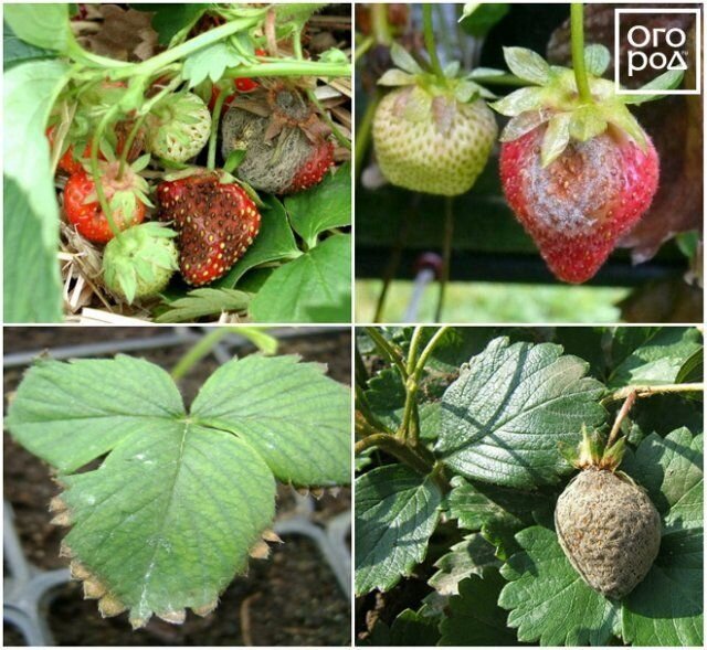 Эта болезнь листьев и ягод клубники быстро распространяется во влажную погоду и в загущенных посадках. Растение покрывается серо-белым налетом, листья сворачиваются в трубочку, их обратная сторона приобретает розоватый оттенок, а больные ягоды выглядят так, будто их кто-то посыпал мукой.