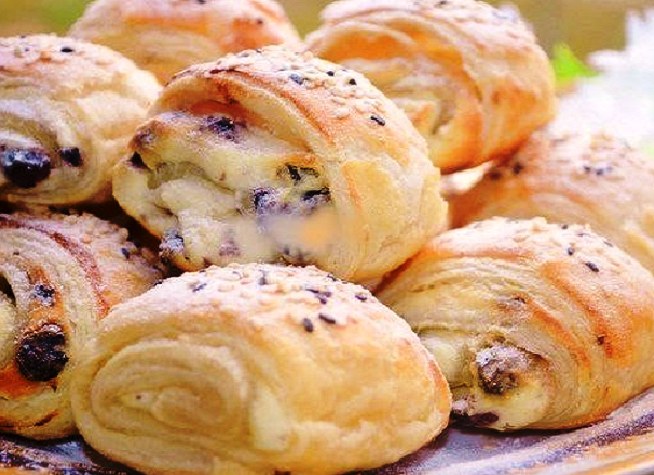 Выпечка из разряда "на скорую руку"! Для тех, кого не часто посещает желание возиться с тестом, а также для тех, у кого желание есть, но времени не хватает. В таких случаях можно воспользоваться уже готовым слоеным тестом, которого полным-полно в продаже. Размораживается оно очень быстро, продается в удобных упаковках, так что работать с ним одно удовольствие. Единственное, что надо помнить - это то, что раскатывать такое тесто надо в одном направлении, чтобы не нарушить структуру. А в остальном все проще простого, начинку можно придумать любую, притом как сладкую, так и соленую. Сегодня хочу предложить побаловать себя выпечкой с творогом - вкусно и полезно! Печеньки получаются легкими, воздушными и в то же время сочными - просто тают во рту! Для приготовления понадобится: 500 грамм творога 500 грамм бездрожжевого слоеного теста 4 стол. л. сахара 2 стол. л. сметаны 2 свежих яйца 1 пакетик ванильного сахара 100-120 грамм изюма по 1 стол. л. кунжута и сахарной пудры. Последовательность