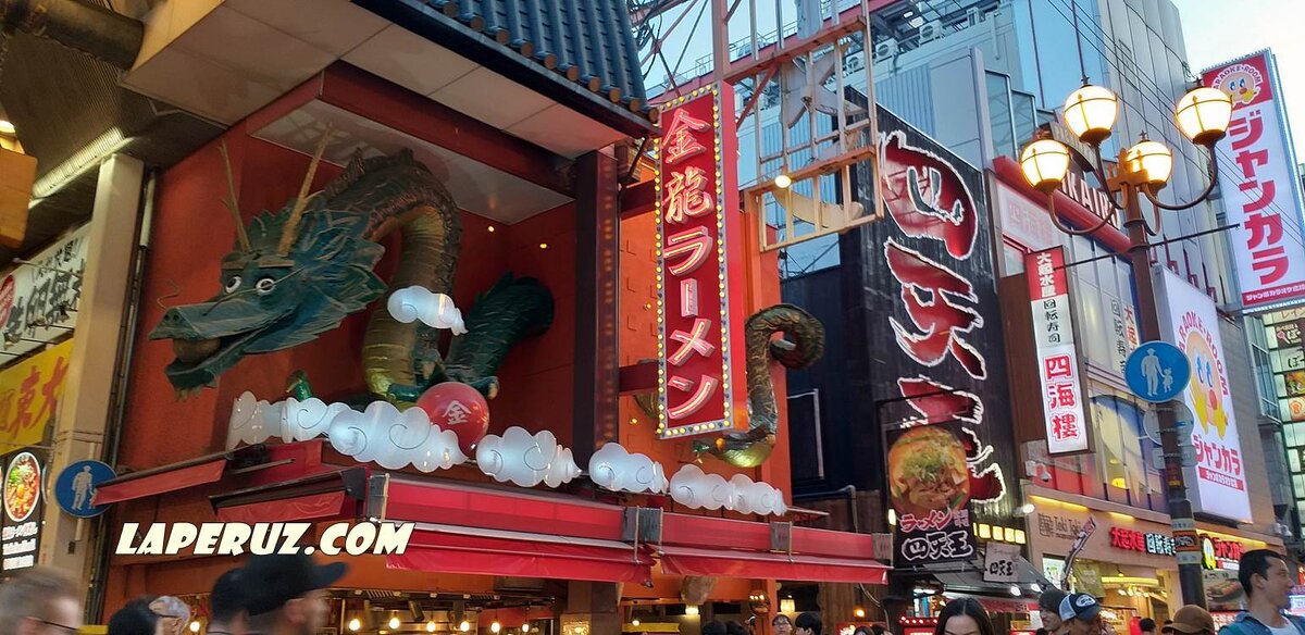 Город Осака, как Болонья в Италии, считается гастрономическим центром Страны восходящего солнца. Японцы любят покушать, и, по совершенно субъективным наблюдениям, едят много и часто. Всем, кто хочет убедиться в том, что именно Осака держит пальму первенства по общепиту, советуют побывать в районе Дотонбори. В этом местечке есть искусственный канал Дотонбори и одноимённая улица. Чтобы попасть в этот район, удобнее всего приехать на метро, выйдя на станции Намба. Поднимайтесь на поверхность и идите вслед за людским потоком. Он обязательно приведёт на Дотонбори, туда ведут все дороги. Чем отличается Дотонбори от других японских улиц? Да всем. Сейчас в подавляющем большинстве улицы в городах — узкие ущелья среди многоэтажных железобетонных монстров, похожие друг на друга. А на этой улице — бесконечный ряд ресторанов, закусочных, магазинов, нарочито ярко и даче кичливо оформленных. Огромные муляжи крабов, коров, рыб, осьминогов. Всё это красочно, с огромными рекламными вывесками, в неоновых