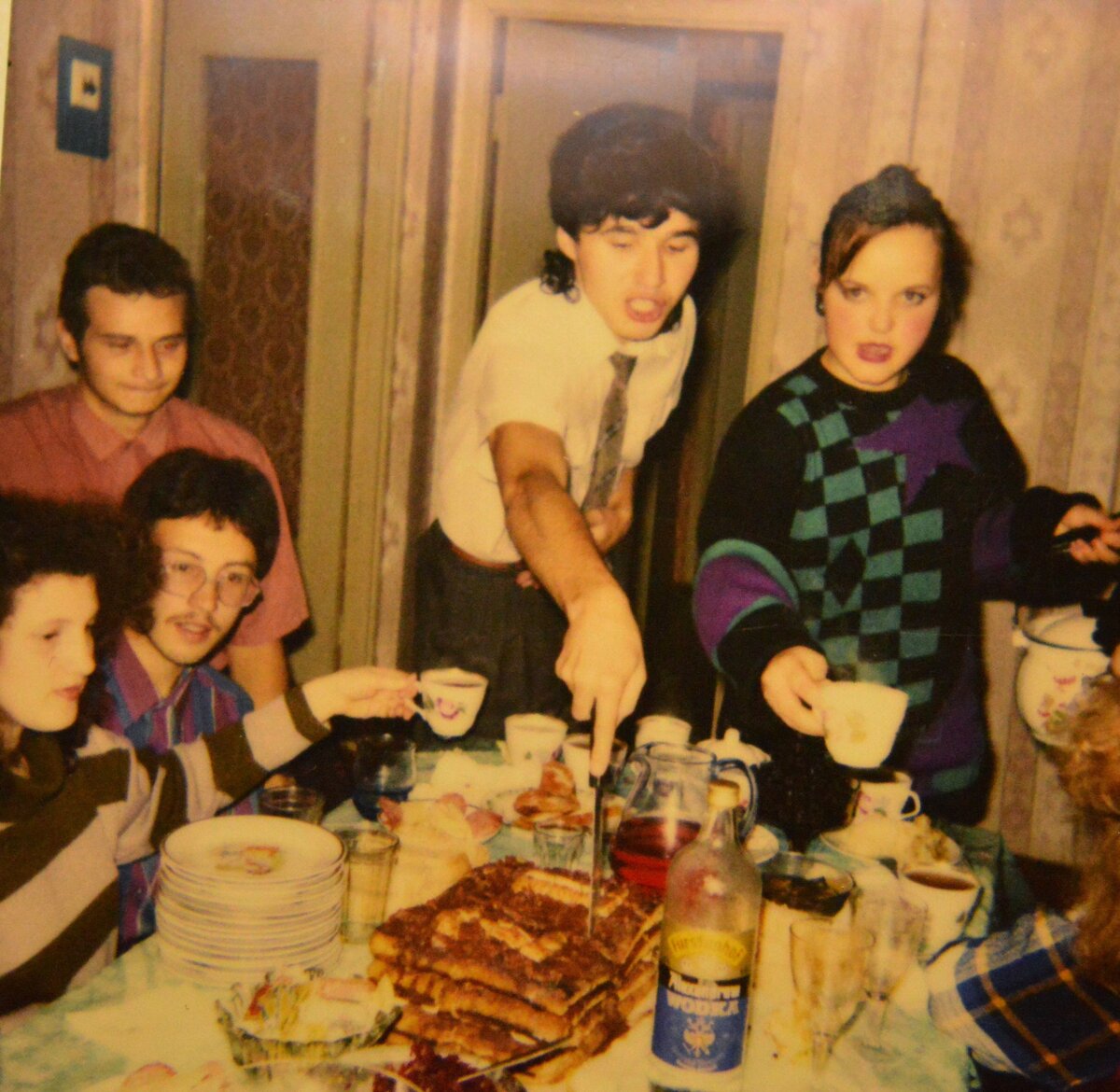 Обратите внимание на столе только одна бутылка водки. И одна бутылка шампанского. На тринадцать человек. Хотя считается, что это были «пьяные» 90-ые.