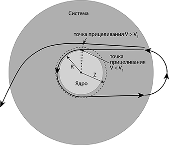 Прицельный радиус захвата Z. Прицельное расстояние, при котором частица проходит точку прицеливания на третьей космической скорости. При прицельном расстоянии, меньшем, чем прицельный радиус захвата, частица будет захвачена гравитационным полем ядра и начнет двигаться по орбите вокруг него или упадет на ядро (см. рисунок).