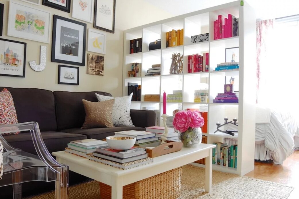 Стеллаж решает много проблем, связанных с ремонтом, по простуде говоря им вообще заниматься не нужно! Просто покупаем стеллаж, наполняем его книгами, декорируем и визуально уже не одна, а целых две комнаты!