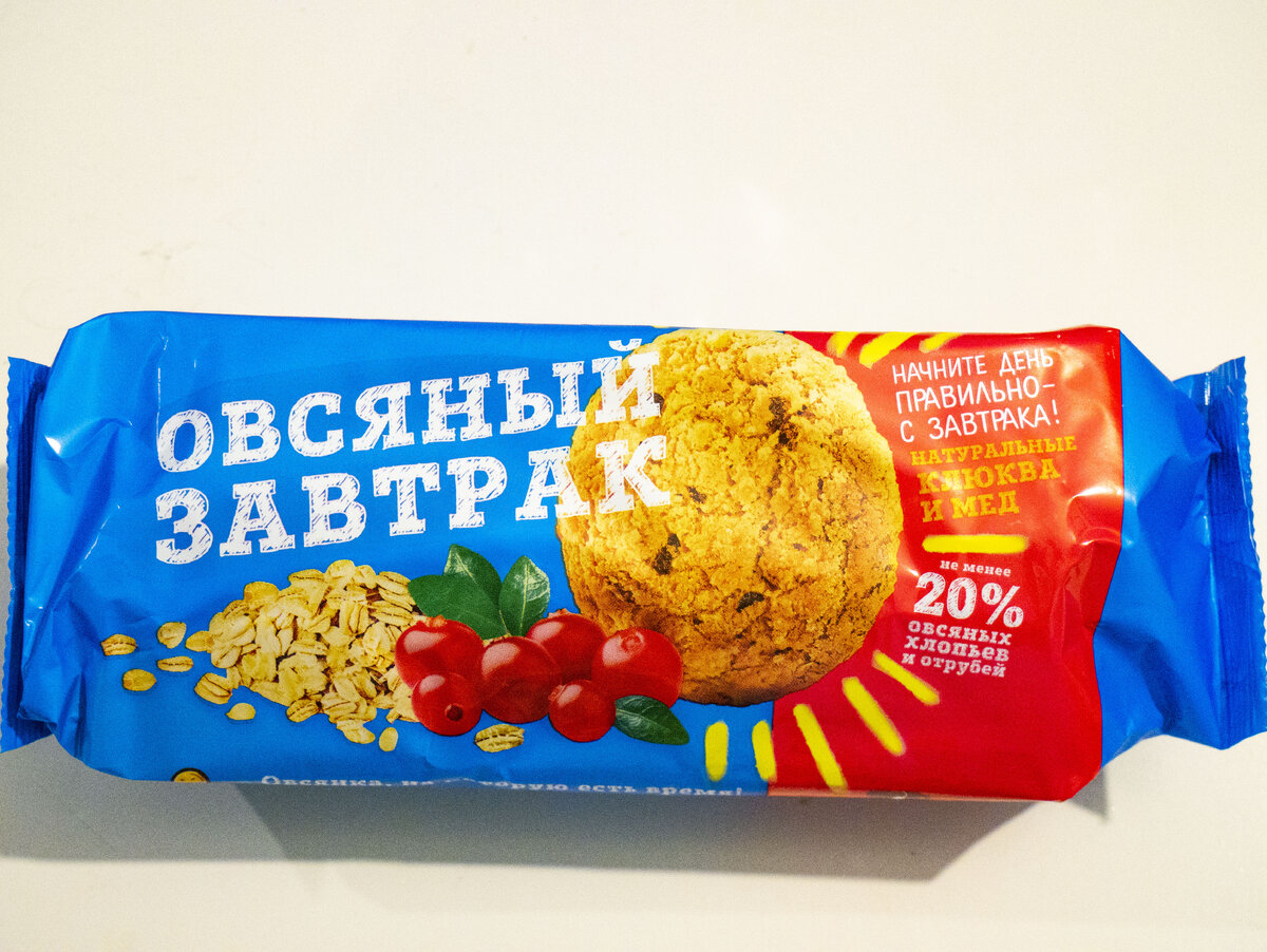 Итак, у меня продолжается cheat day и день открытий. В магазине "Магнит" купил себе сегодня сладостей. Зефир я уже поробовал, теперь очередь печенья. Овсяное печенье я люблю с детства, даже несмотря на то, что они на самом деле не содержат ни грамма овса. Но в последнее время стали попадаться исключения. Вот одно из них. Согласно этикетке, в составе этого печенья на первом месте стоит пшеничная мука. Ну куда ж без нее в овсяном-то печенье! Но, помимо этого в составе есть овсяные хлопья, отруби, и мука, а также резаная клюква. Что важно лично для меня, в составе нет маргарина и пальмового масла. Цена печенья 54 рубля, что вполне сопоставимо с аналогами из обычной муки. Однако, вкус я вам хочу сказать не идет ни в какое сравнение! Даже 20% овсяного сырья делают печенье принципиально иным. Я не мог оторваться, пока не съел всю пачку. Кстати, по ГОСТу овсяное печенье должно содержать не менее 14% овсяной муки. Не знаю, может и содержит, но как-то не чувствуется. Возможно дело именно в хло