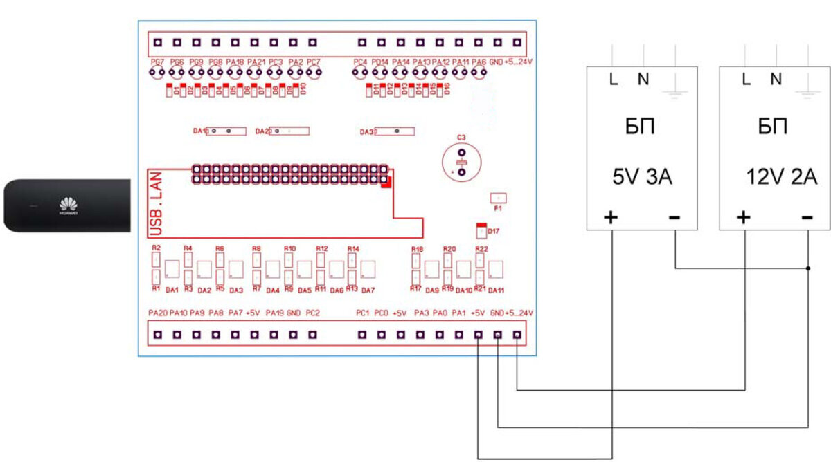 Соединим микрокомпьютер с платой расширения, вставим модем с SIM-картой в USB слот MK и подадим питание согласно схеме.