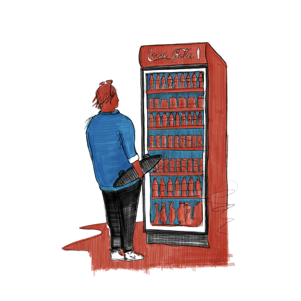 Изображён я и холодильник, тупить перед холодильниками с колой в одиннадцать вечера - лучшая медитация! Представьте красивый, немного потёртый, испачканный и искошенный блокнот, у меня такой начат, а затем в моей жизни появился АйПад и блокноты мне не нужны стали. Вожу теперь пластиком по стеклу и получаю картинки и удовольствие, но право не хватает шершавости под пальцами, я ещё множество раз напишу о своём предательстве к бумаге, а сегодня предательский рисунок из под стекла. Хвастаюсь.
