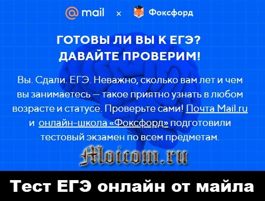Тест ЕГЭ онлайн от майла и фоксфорда Привет друзья, сегодня будет небольшой пост о тесте ЕГЭ онлайн совместных усилий корпорации майл.ру и сайта фоксфорд.ру. Хотите освежить свои знания и вспомнить школьную программу? Тогда этот тест для вас. Пройти его может любой желающий. Проходим экзамен ЕГЭ Открываем сайт егэ.майл.ру Давайте посмотрим готовы ли вы к Единому Государственному Экзамену по всем предметам. Ваш возраст, увлечения и статус здесь не имеют значения. Перед запуском теста желательно представиться. Указываем возраст, выбираем из предложенных вариантов кто вы — школьник, учитель, родитель, студент или любопытный возраст. Школьный ЕГЭ ограничен временными рамками, данный экзамен займет примерно пол часа вашего времени. Нажимаем синюю кнопку пройти тест и выполняем задания. Данный онлайн сервис отличный инструмент для подготовки к единому экзамену по всем основным предметам общеобразовательной школьной программы.