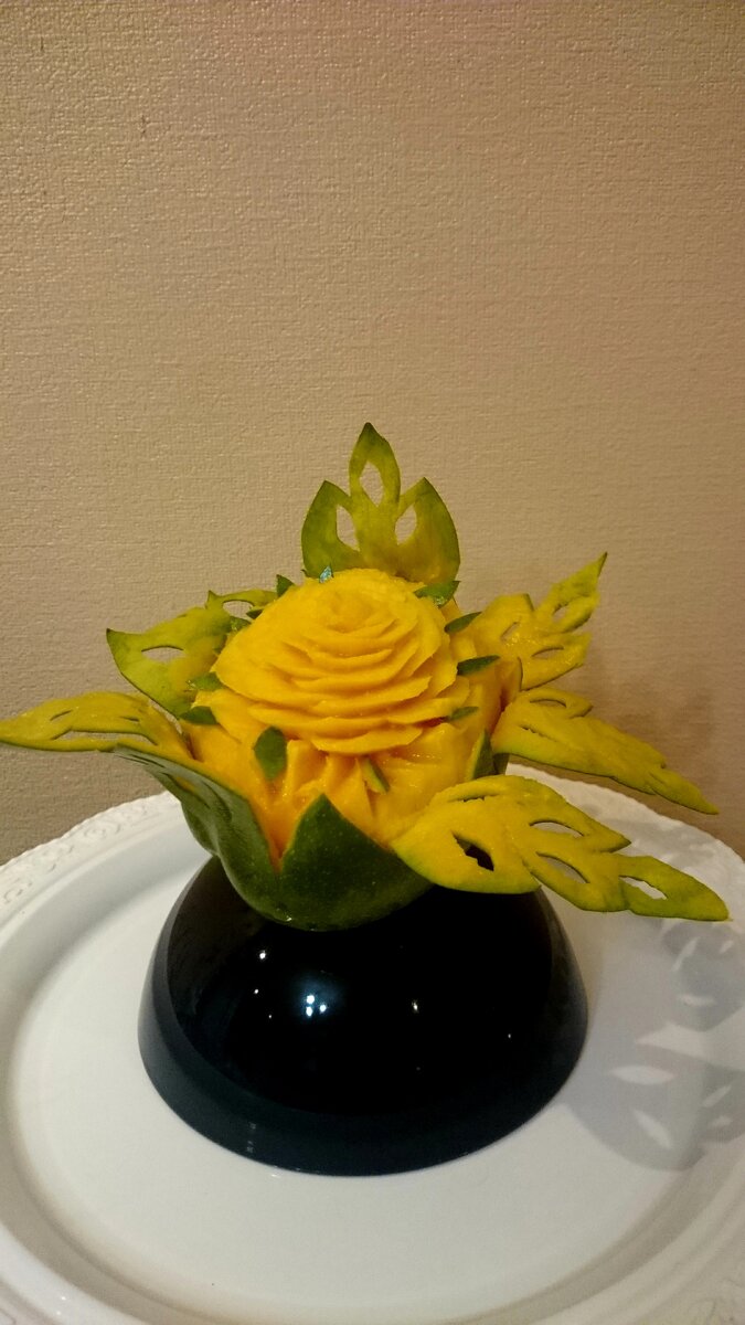 Манго в торговых центрах продают круглый год, любое время можно купить, но таких крупных редко бывает, значит мне повезло. Выбираем манго не сильно спелую, если спелое , вырезать цветы тяжело. Сначала я начинаю вырезать листья один за другим, у меня получилось семь штук, потом аккуратно начинаю снимать до половины, дальше я опускаю листья еще чуть- чуть ниже и начинаю вырезать из мягкой части манго розу с помощью тайского ножа, аккуратно, не повредив вырезанные листья. Вот такая красота у меня получилась. Автор: Вера Желтова