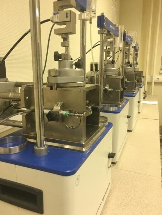 Всего было проведено 48 испытаний: 36 испытаний с мелкими песками и 12 испытаний с крупными. Испытания проводились на приборе одноплоскостного среза. Время предварительного уплотнения грунта составило 10 минут, скорость сдвига — 0,2 мм/мин. Для мелких песков зазор устанавливался величиной 0,2-0,4 мм, а для крупных песков