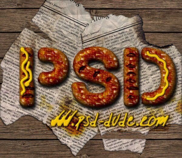 В этом уроке вы узнаете, как создать текст из жареных колбасок в программе Photoshop, используя стили слоя, а также текстуру еды, в данном случае, текстуру мяса. Текст из мясных колбасок хорошо сочетается с горчицей, поэтому, мы добавим такую деталь, как горчица, которую вы можете увидеть на итоговом изображении. Скачать архив с материалами к уроку ОК. Давайте приступим! Итоговый результат: Шаг 1 Давайте начнём с простой текстуры дерева, которую мы используем в качестве заднего фона для нашего текста. Текстура напоминает обычный деревянный стол. Далее, к слою с деревянной текстурой, примените коррекцию Яркость / Контрастность (Brightness / Contrast), чтобы затемнить текстуру. Шаг 2 Добавьте текстуру старой газеты на наш рабочий документ. Удалите белый задний фон с текстуры газеты. Продублируйте слой с текстурой старой газеты, поверните обе газеты, как показано на скриншоте ниже. Для каждого слоя с текстурой старой газеты, добавьте стили слоя Тень (Drop Shadow). Шаг 3 Выделите оба сло