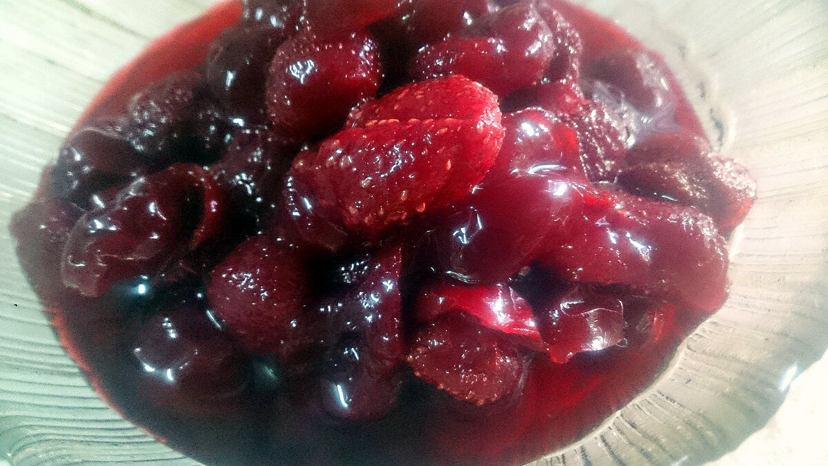 В последнее время, мы часто сочетаем в варенье несколько ягод или фруктов. Мы обратили внимание, что так и вкуснее и оригинальнее. Любое, даже самое вкусное варенье, имеет свойство приедаться. Вот, решила с вами поделится, нашим новым рецептом варенья из клубники и вишни. Варенье очень вкусное и очень красивое! Ингредиенты: клубника - 0,5 кг; вишня - 1 кг; сахар - 750 гр; Способ приготовления: Клубнику перебираем, отрываем хвостики, быстро моем (долго ее в воде не надо держать, иначе она потеряет свой внешний вид). Складываем в кастрюлю в которой будем варить варенье. Вишню моем, вынимаем косточки и отправляем к клубнике. Пересыпаем их сахаром и даем ягодам пустить сок. Как только сахар полностью растворится начинаем варить варенье. Для этого кастрюлю ставим на медленный огонь, доводим до кипения и с разу же выключаем, даем постоять варенью 3 часа. Варенье не перемешиваем, чтобы сохранить форму ягодок и они не развалились! Так проделываем два раза, а на третий, с разу после закипания р