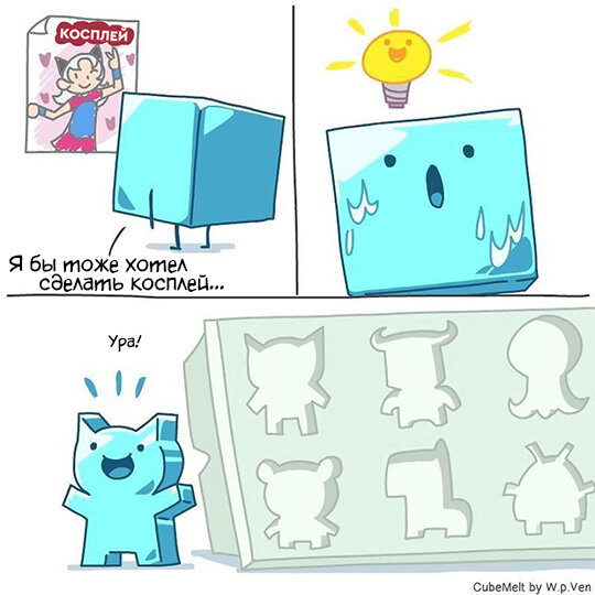 Комиксами с людьми в главных ролях уже никого не удивишь. Даже говорящие животные и растения уже не вызывают удивления. А что если... ну не знаю... скажем, сделать главным героем серии комиксов кубик льда? Именно такая идея и пришла в голову художнику по имени Пэн Вен Вонг. В итоге на свет появилась серия добрых и очень милых комиксов "Cubemelt", рассказывающая о приключениях маленького кубика льда, которому приходится очень непросто в нашем тёплом мире, но несмотря ни на что, ему удаётся не унывать и сохранять ту энергию и любовь к жизни, которую, к сожалению, иногда теряют люди. История создания этой серии очень любопытна: автор рассказывает, что комиксы эти появились в момент, когда тот переживал тяжёлый творческий кризис - 36-летний художник потерялся в себе и в жизни, не мог понять, что ему делать и к чему стремиться в будущем. И в этот момент, его внимание почему-то привлекли кубики льда на дне стакана с колой... «Я смотрел на лёд в своём стакане и чувствовал, что моя жизнь тает