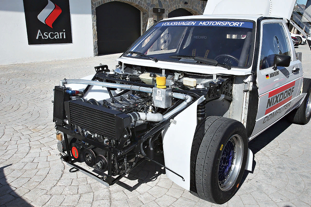 В этом Гольф 2 бьются два сердца, и они мощные: как спереди, так и сзади делает себя 1,8 литровый большой двигатель с турбонаддувом KKK из Golf 2 GTI 16V широкий (мощность: 326 л. с.). Гольф может работать с полным приводом, передним или задним приводом Каргес интерьер: кокпит сводится к самому необходимому. Два двигателя требуют двух стартеров. Бимоторный гонщик весит 1020 килограммов. Поскольку оба двигателя имеют свой собственный гоночный редуктор Hewland, гольф может быть перемещен с полноприводным или только с передним или задним приводом. Голый кокпит он предлагает только самые необходимые переключатели и фитинги, которые вставлены в голый металл. Две кнопки запуска, два рычага для топливных насосов, но только один тахометр. Рычаг переключения передач в обычной схеме H управляет двумя редукторами. Поскольку не полностью синхронные двигатели распределяют свою силу неравномерно по своей оси, болид bimotor постоянно легко перемещается в зигзаге. Ускорение вызывает уважение Video: