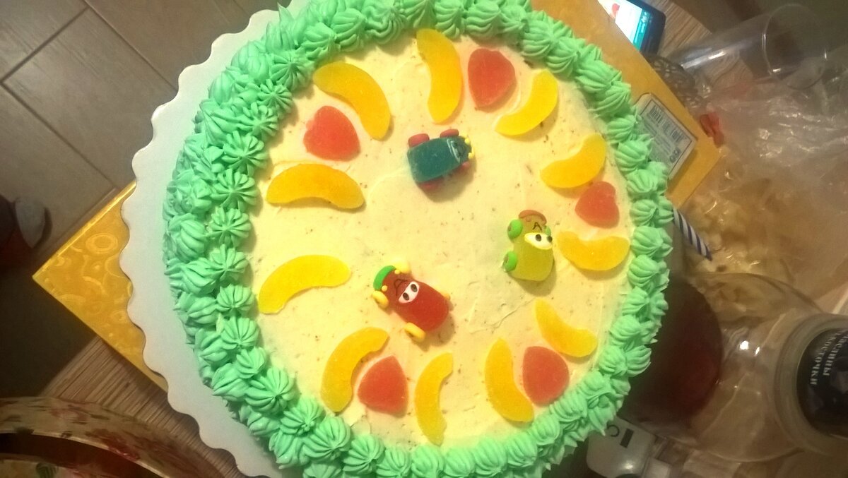 Когда нет возможности заказать в кондитерской красивый торт на день рождение ребенку, необходимо подключать свои фантазии и верить в свои силы, что у тебя все получиться. Именно с таким настроем я решила действовать. Уж очень мои дети радовались ярким и нарядным тортам на днях рождениях детей моих знакомых и друзей. Я решила что тоже буду удивлять. Пересмотрела кучу разных сайтов с соответстующей тематикой. И пускай у меня с первого раза и не получится шедевр кондитерского искусства - подумала я, зато во всяком случае я попробую. Первый мой торт получился совсем не плох, хотя я и не преуспела в его оформлении. В дело пошли самые обыкновенные желейные конфетки из сетевых магазинов. В следующий Раз будет еще лучше подумала я. Решила что стоит попробовать с мастикой. Занимательное это дело - хочу я вам сказать. Будто из пластилина лепишь различного рода формы. Вот такой чудесный тортик у меня вышел. . Очередной день рождения сына праздновался вот с таким замечательным котом. Пускай