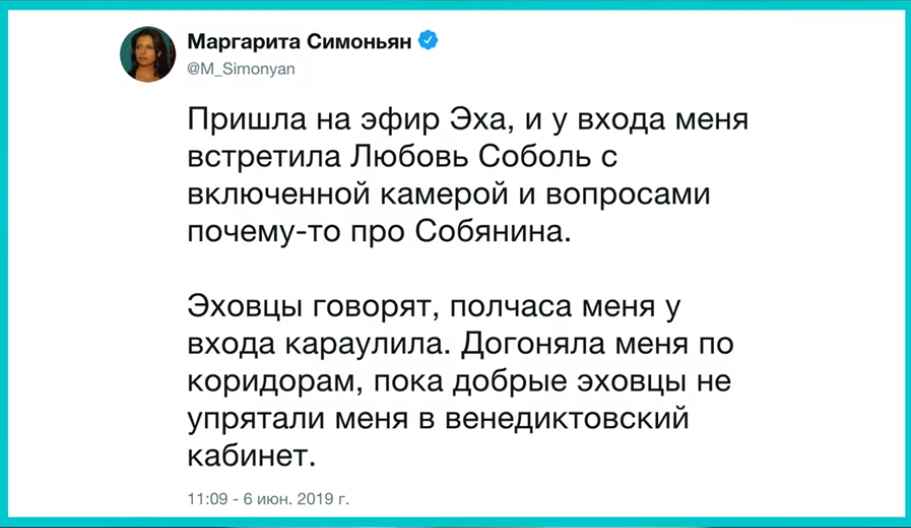 Вроде все логично. Симоньян государственный пропагандист с доступом к огромной аудитории. Она ярый сторонник Собянина, которая видит только хорошее в деятельности мэрии и отказывается освещаться любые события, которые бы могли негативно сказаться на деятельности мэрии.