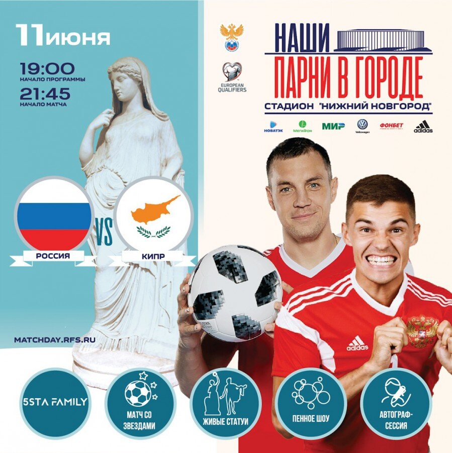 В 21:45 в Нижнем Новгороде состоится долгожданный матч для всех жителей нашего города. Сборная России встретится с командой из Кипра. После блестящего выступления бело-сине-красных 8 июня, болельщики ждут от наших только победы. Но каков же расклад? Есть, что вспомнить В сегодняшнем противостоянии Россия – фаворит. Второе место в группе, 14 голов после трех игр, покер Дзюбы, дубль Смолова в матче с Сан-Марино, рев трибун на домашнем стадионе, который должен повториться и сегодня, - безусловно, все эти факторы просто обязаны оказать влияние на исход игры. Кроме того, главный наставник россиян Станислав Черчесов вряд ли позволит своим подопечным расслабиться. Да и для самих футболистов это последняя встреча перед отпуском, и скорее всего им бы не хотелось идти отдыхать, не поставив красивую запятую в отборочном турнире. Однако не стоит недооценивать Кипр. В последний раз наша сборная встречалась с киприотами в 2003 году. Однако более показательной стоит считать квалификационную игру к