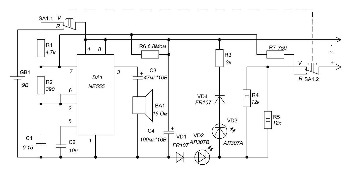 В практической работе электриком не всегда удобно пользоваться аналоговыми и цифровыми тестерами. Они требуют аккуратного к себе обращения - при падении могут выйти из строя. Хорошим выходом из этой ситуации является использование простых пробников. На рис.1 представлена принципиальная схема пробника, который обладает следующими возможностями. 1. Измерение сопротивлений резисторов от Омов до 15МОм. 2. Измерение напряжений - переменного от10 до 380В, постоянного от 10 до 250В с индикацией полярности. 3. Проверка годности полупроводниковых приборов и конденсаторов. Индикация звуковая, при которой частота звука в режиме измерения сопротивлений изменяется от 6,3кГц (короткое замыкание выводов до 2Гц при измерении резистора 15МОм). Пробник выполнен на микросхеме NE555, работающем в мультивибраторном режиме. Он способен работать при напряжении питания от 5В до 18В, имеет высокую стабильность частоты, выходной ток составляет 0,2А. Частота генерируемых импульсов определяется по формуле