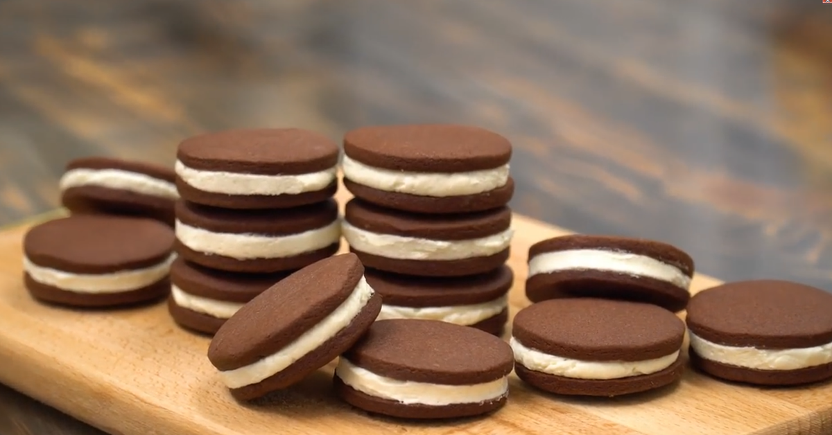Детям и взрослым такое печенье точно понравится. Нам понадобится: Мука - +/- 100 гр. Сахарная пудра - 50 гр. Сливочное масло - 75 гр. Какао-порошок - 25 гр. Желток - 1 шт. Разрыхлителя (по желанию) - 0,5 ч.л. Щепотка соли Крем: Сливочное масло - 80 гр. Сахарная пудра - 80 гр. Ванилин Приготовление: Смешиваем мягкое сливочное масло с сахарной пудрой, слегка перемешиваем. Добавляем щепотку соли и взбиваем миксером 1-2 минуты до пышной пенки. Добавляем желток и все еще раз перемешиваем. Смешиваем какао с мукой и просеиваем в тесто, добавляем разрыхлитель. Все хорошо перемешиваем миксером или руками до однородной массы. Заворачиваем в пищевую пленку и отправляем в холодильник на 2 минут. Достаем тесто и раскатываем до 3 миллиметров. Выкладываем на пергаментную бумагу. Выпекаем при температуре 180 градусов 7-10 минут. Печенье поднимется совсем чуть-чуть, так что не смущайтесь. Готовим крем: Берем размягченное масло, взбиваем его миксером 1-2 минуты, до пышности. Добавляем сахарную пудр