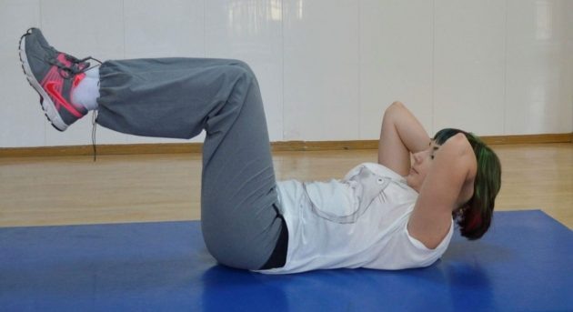 В нижней точке не ложитесь полностью на спину. Задержитесь в двух сантиметрах от пола. Так вы сохраните напряжение в мышцах и эффективнее их проработаете. Обязательно держите руки за головой.