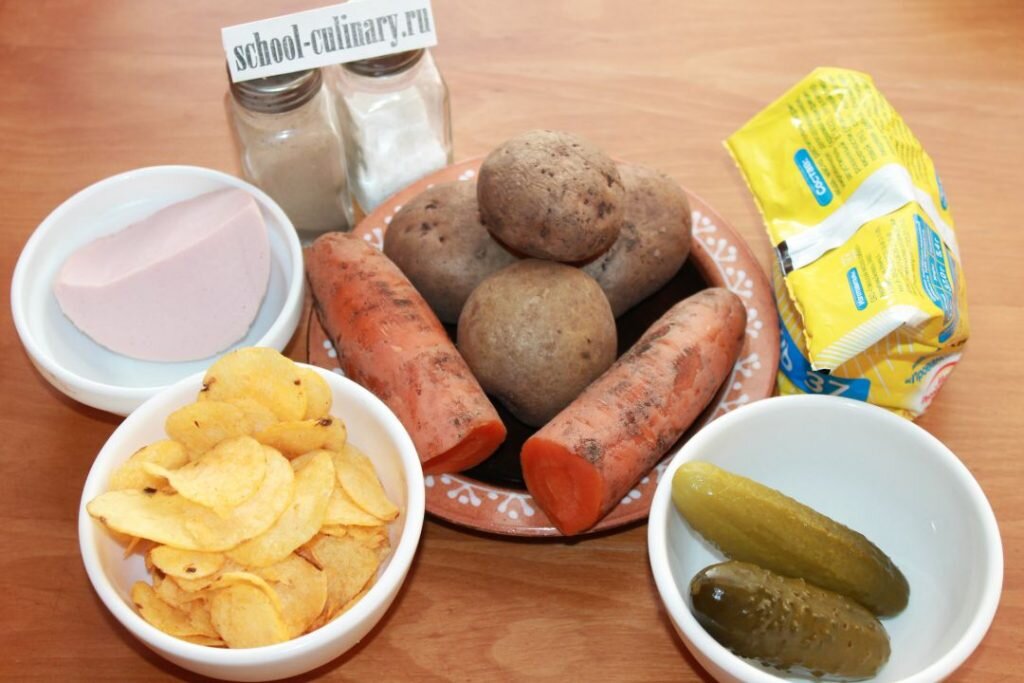 Удивительной красоты кушанье украсит любое застолье. Салат Подсолнух очень хорош. В его составе колбаса, вареные овощи и маринованные огурцы. Роль лепестков выполняют круглые чипсы. Получается очень эффектно. Создается впечатление, что на столе распустился настоящий цветок. Готовится же подобное блюдо просто и из доступных компонентов, так как отличается от классического варианта. Ингредиенты: Приготовление: Картофель и морковь моем и кладем в кастрюлю с холодной водой. Ставим на огонь и варим в мундирах до готовности. В зависимости от сорта овощей понадобится 20-30 минут после закипания воды. Когда овощи сварятся, охлаждаем их, вынув из воды. Очищаем. Формируем салат. Собирать его можно на большом общем блюде или порционно. Трем на крупной терке картофель и кладем его в цент тарелки в виде шайбочки. Солим, приправляем специями по вкусу. Делаем майонезную сеточку. Натираем на терке морковь и укладываем ее сверху на картошку. Также посыпаем солью и специями. Поливаем майонезом. Трем н