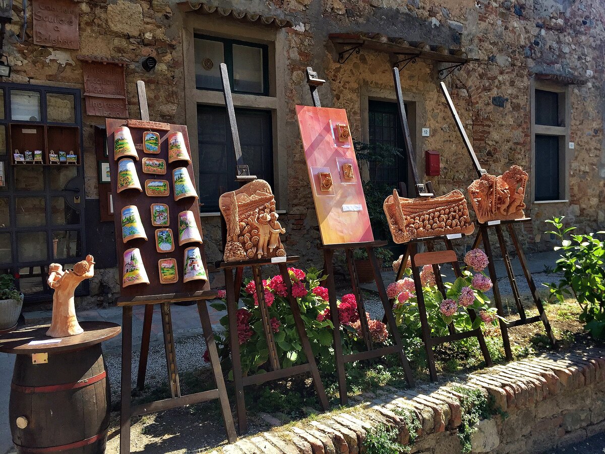 Кто не может пройти мимо керамических лавок - тот я. Особенно, если всякие керамические штуки стоят на видном месте. Особенно, если Мастер работает там же и можно посмотреть и познакомится с ним. Где-то среди большого количества фоток у меня есть еще другие фотографии Мастера, визитка и пару листиков распечатанных на принтере (он мне их и дал) с информацией о нём. Когда готовил пост, даже понял, что не знаю как зовут Мастера. Постараюсь найти его визитку. Узнав, что я из России - Мастер обрадовался и показал альбом с письмами. Среди писем была подшивка писем с Сергеем из Санкт-Петербурга. Запечатанных, конечно. Так что, если вдруг Сергей из Санкт-Петербурга читает этот пост и узнал Мастера, а не узнать его сложно, то знайте - Ваши письма на почетном месте в альбоме. Все эти фото сделаны в Болгери (регион Тоскана) - это субрегион известен своим вином на весь мир, и люди сюда точно не за керамикой приезжают, а за вином. Но это в других рассказах. Но вы точно не пройдёте мимо сувен