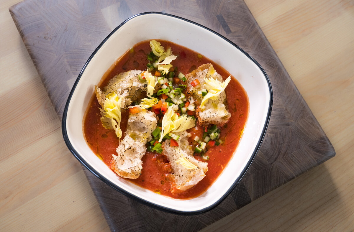 В жаркую погоду хочется легкого, сытного, утоляющего голод, но не перегружающего организм блюда. Попробуйте приготовить гаспачо - традиционный испанский холодный томатный суп. Он может стать хитом вашего летнего рациона, так как идеально подходит для обеда или ужина в жаркий летний день. Ингредиенты: Томат - 5-6 шт Огурец - половина Чеснок - 1 зубчик Бальзамический уксус - 2 ч.ложки Стебель сельдерея - 1 шт Соус табаско - 2 ч.ложки Оливковое масло - 60 мл Зеленый лук - 1 перышко Болгарский перец - небольшой кусочек Черный перец горошком мягкий - 10-12 шт Черствый хлеб - ломтик Смесь перцев Соль Приготовление: Самое главное в гаспачо - выбрать вкусные томаты, так как они являются основным ингредиентом. Их очищаем от кожуры, режем на крупные дольки и отправляем в куттер. Солим, перчим и добавляем один маленький зубчик чеснока, нарезанный мелким кубиком. Туда же наливаем примерно две чайные ложки бальзамического уксуса (если есть, лучше взять хересный уксус) и соуса табаско. Макушечку сте