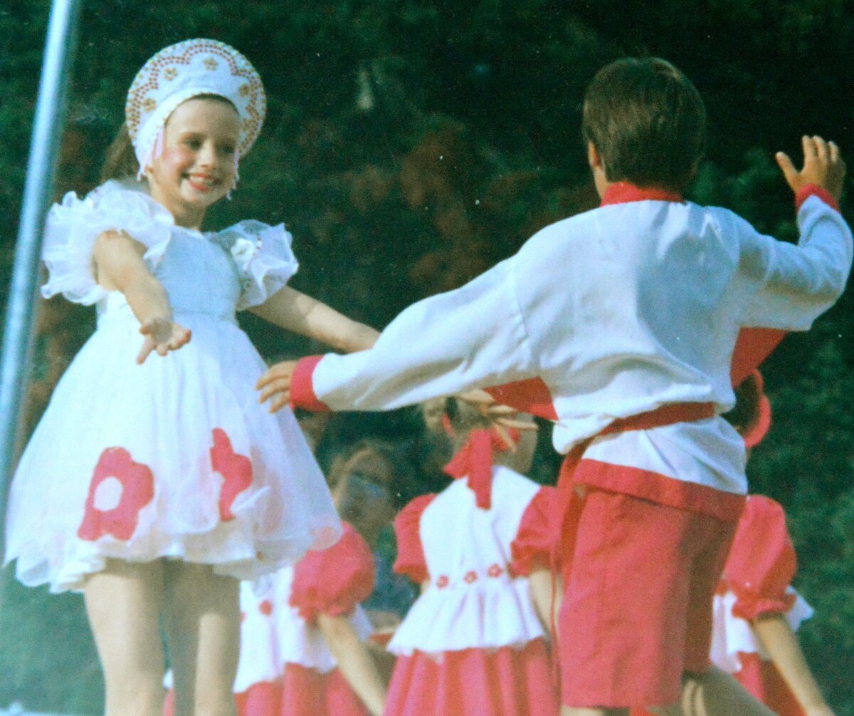 На концертах за кулисами мы часто встречались. Она ничем не выделялась. Ну разве что очень худенькая, маленькая, 7 лет, большие-пребольшие глаза, внимательные, умные, большая-пребольшая улыбка на сцене, и еще она во многих детских танцах солировала. Не помню, может быт после выступления я пару раз сказал ей «Молодец!». Но я так говорил всем маленьким танцорам. Я даже, по началу, не знал, как её зовут. Но на репетициях, Галина Ивановна называла малышей по именам. И запомнилось.