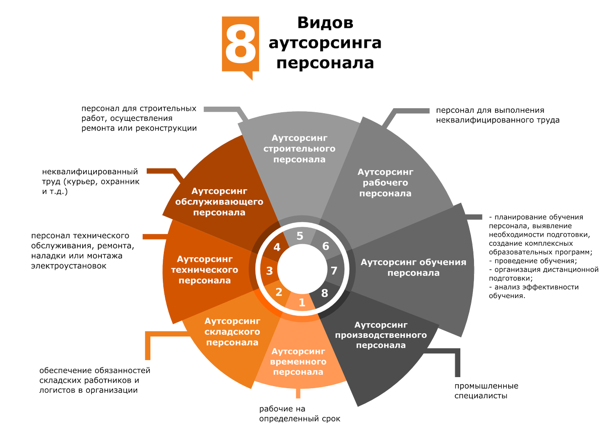 Аутсорсинг персонала и бизнес-процессов представляет собой наиболее глубокую и сложную форму аутсорсинга. Она предполагает весьма тесное взаимодействие между заказчиком и исполнителем. Фактически, происходит передача в аутсорсинг определенной сферы деятельности компании. Это непрофильные сферы, не связанные с извлечением дохода. К таковым относятся, например, решение вопросов по персоналу, юридическое сопровождение. Особенности аутсорсинга по персоналу Представленная услуга заключается в том, компания – аутсорсер будет осуществлять решение всех вопросов, связанных с персоналом заказчика. Это следует рассмотреть более подробно: Таким образом, вся сфера деятельности, связанная с кадрами находится в зоне ответственности специалистов компании - исполнителя. В чем преимущества такого аутсорсинга Указанный аутсорсинг весьма выгоден заказчикам. Так, благодаря данной услуге заказчик существенно сокращает издержки. Ведь ему уже не нужно содержать в своем штате специалистов по кадрам, не ну