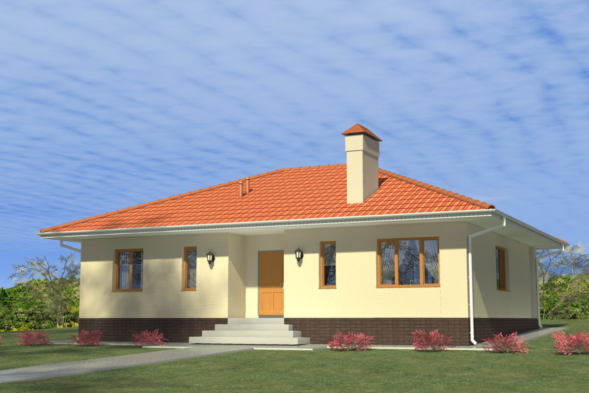 Проект удобного и компактного дома, оптимального для проживания семьи из 4 человек. Комфортабельный коттедж обладает всеми необходимыми помещениями. Жилое пространство организовано рационально, без сквозных комнат или коридоров. Размер дома подходит для строительства на небольшом участке. Конструктив данного проекта (фундамент, стены, кровля и т.д.) будет заменён под Ваши пожелания и климатические условия региона застройки. Внесение этих изменений входит в базовую стоимость проекта. Цена проекта: 10 000₽ Внешний вид, варианты наружной отделки Парадный вход в дом несколько утоплен в стену фасада. Полученная ниша выполняет роль крыльца. Кроме этого, фронтальная плоскость не имеет никаких архитектурных дополнений. Простота решения дает возможность применить массу способов наружного оформления стен. Для отделки подойдут любые стили и варианты, могут быть использованы натуральные или синтетические материалы. Подойдет облицовка натуральным или искусственным камнем, установка фасадных панел
