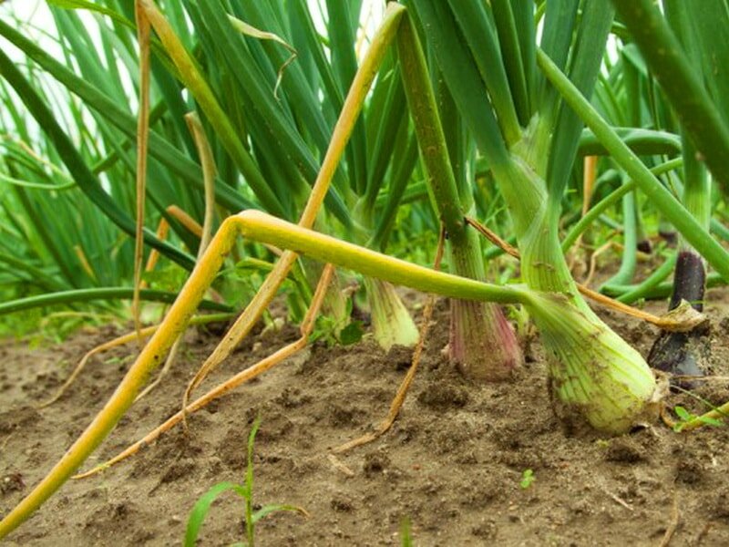 Случается, что рановато еще зеленым перьям лука желтеть, но они упрямо бледнеют, желтеют и подсыхают, не смотря на благоприятные условия роста. В чем же проблема? Давайте вместе разберемся. Недостаток азота и калия Обедненные почвы, которые давно не удобрялись органикой, вполне могут спровоцировать пожелтение лука, особенно если выращивать его несколько лет на одном и том же месте. Огородники, которые не приветствуют минеральные подкормки, с удовольствием используют простой, но эффективный рецепт: нужно приготовить настой сброженной травы и золы. Эту подкормку можно использовать каждые две недели на протяжении всего вегетационного периода до момента, когда начнут созревать луковицы, то есть весь май, июнь и июль. Эту подкормку вносят по влажной земле, ведро на 1 м² посадок. После подкормки лук становится насыщенно зеленым, перья начинают расти вверх, а не остаются толстыми и короткими. Недостаточный полив К сожалению, никакие подкормки не спасут, если в почве слишком мало влаги. Лук н