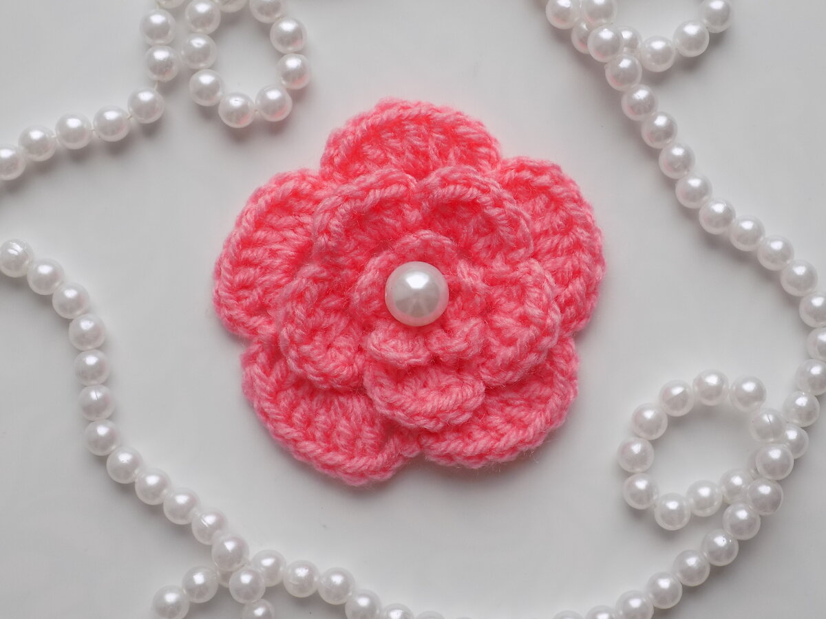 - соответствующий крючок. Вязание этого цветка Оля начала с создания магической петли, которую в дальнейшем потребуется стянуть. Потом провязала 5 воздушных петель. Потом присоединила эти воздушные петли обычным столбиком к магической петле. Так получилась заготовка для первого лепес
