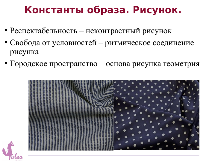 Рисунок — очень выразительный и важный инструмент в работе над своим стилем. Важно понимать, как и в каком количестве он будет присутствовать. Может у нас вообще не будет рисунка, может он будет лишь в деталях, а может быть их будет много и разнообразных. В первую очередь рисунок, конечно, зависит от ассоциации образа. Создаем тему природы - будут изображения растений, листьев, животных или пейзажные принты, в теме королевы могут быть завитки и вензели, короны и крупные цветы на мотив лилий. Однако стилистика может меняться со временем, и смысл принта - тоже. Но даже в этом случае структура рисунка для вас останется неизменной: размерность, линейность и характер исполнения для вашего принта определены. То есть, если ваши черты утонченные и хрупкие, то и рисунки (какую бы ассоциативную тему мы не раскрывали) будут тонкими и ломкими. А уже сам мотив (цветок, геометрия, абстракция или что-то другое) будет зависеть от идеи образа. Сказать, что вам нужен цветочный рисунок — это не сказ