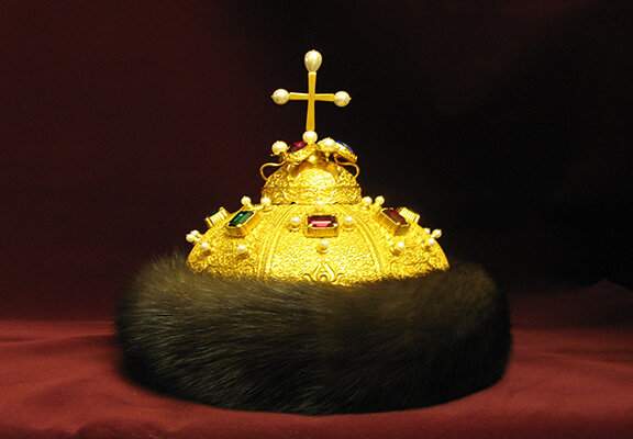 Эта главная регалия русских царей и князей. По преданию, эта шапка стала подарком византийского императора Константина Мономаха, двоюродного деда князя Владимира. Форма головного убора символизирует небо и солнце. Опушка из соболя – небо, а позолоченный верх, украшенный жемчугом и драгоценными камнями – солнце. На самом верху крест как символ богоизбранности царя.