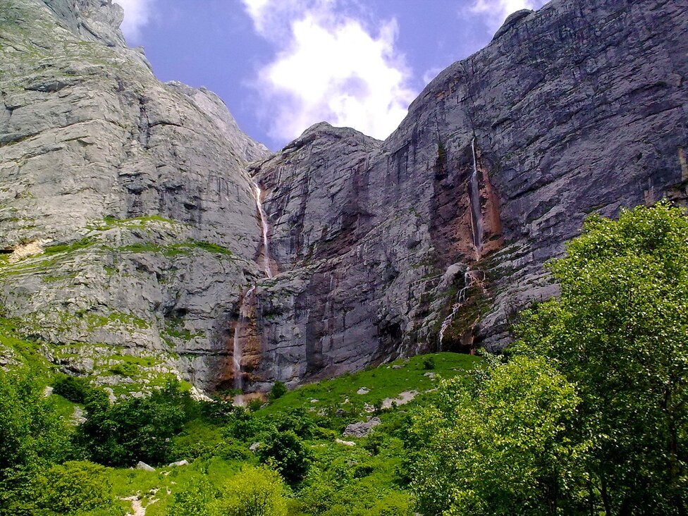 Пшехский водопад ниспадает с перевальной ступени Фишт-Пшеха-Су. Высота отвесных склонов гор, рядом с водопадом, просто потрясает. Чтобы оценить масштаб, присмотритесь на фото ниже: по снегу под скалой идут туристы, видите?
