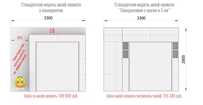 «Псевдо экономия» производителей шкаф кроватей привела к тому, что мы ярко отличаемся от них, мы делаем мебель с шагом 5 см в высоте и ширине. Таким образом вы получите мебель которая действительно экономит пространство и ваши деньги.