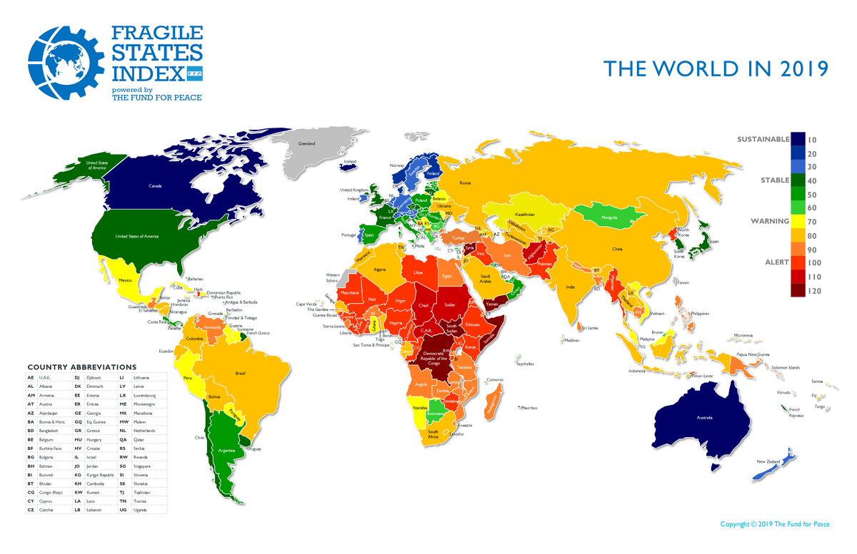 Индекс неустойчивости государств(Fragile States Index) ежегодно публикуется организацией Фонд мира. Он оценивает способность государственной власти справляться с различными вызовами, преимущественно внутренними. Для вычисления показателя нестабильности в стране, используется несколько индикаторов, в том числе: