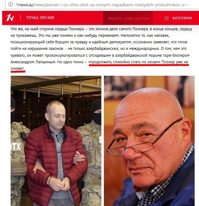 Народ, эти деятели с берегов Каспия переплюнули даже Северную Корею в своих агрессивности и хамстве. Угрожать знаменитому российскому телеведущему, журналисту и общественному деятелю Владимиру Познеру "...он больше не будет спать спокойно по ночам" - это тянет на уголовную статью преследованиях за номером 119 УК РФ «Угроза убийством или причинением тяжкого вреда здоровью». Причем, угрозы заявляет не какой-то интернетный писака, а официальный сайт Первого телеканала Азербайджанского телевидения: http://1news.az/ Знаете, почему власти Баку собираются, как они выразились, заставить Владимира Познера "прекратить спокойно спать по ночам"? Он, будучи в Ереване заявил в интервью, что к сожалению график его поездки слишком плотный и он не сможет посетить Нагорный Карабах. Чует моё сердце, ливийский сценарий в Азербайджане не за горами. Муаммар Каддафи в какой-то момент тоже потерял связь с реальностью и возомнил, что он реально великий правитель планеты Земля и ему простят все. Просто пот