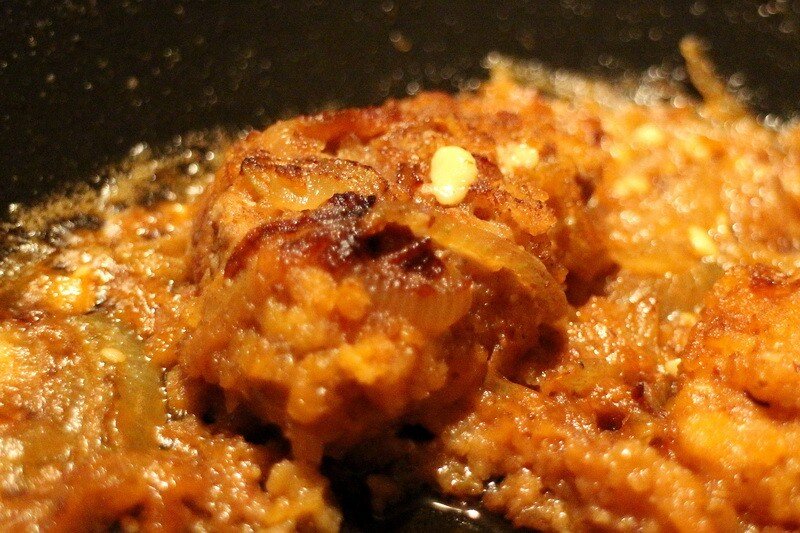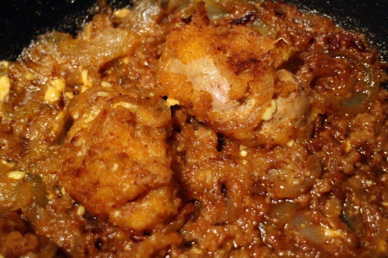 4. Бараньи семенники обвалять в сухарях как следует и выложить на сковороду к луку, обжарить