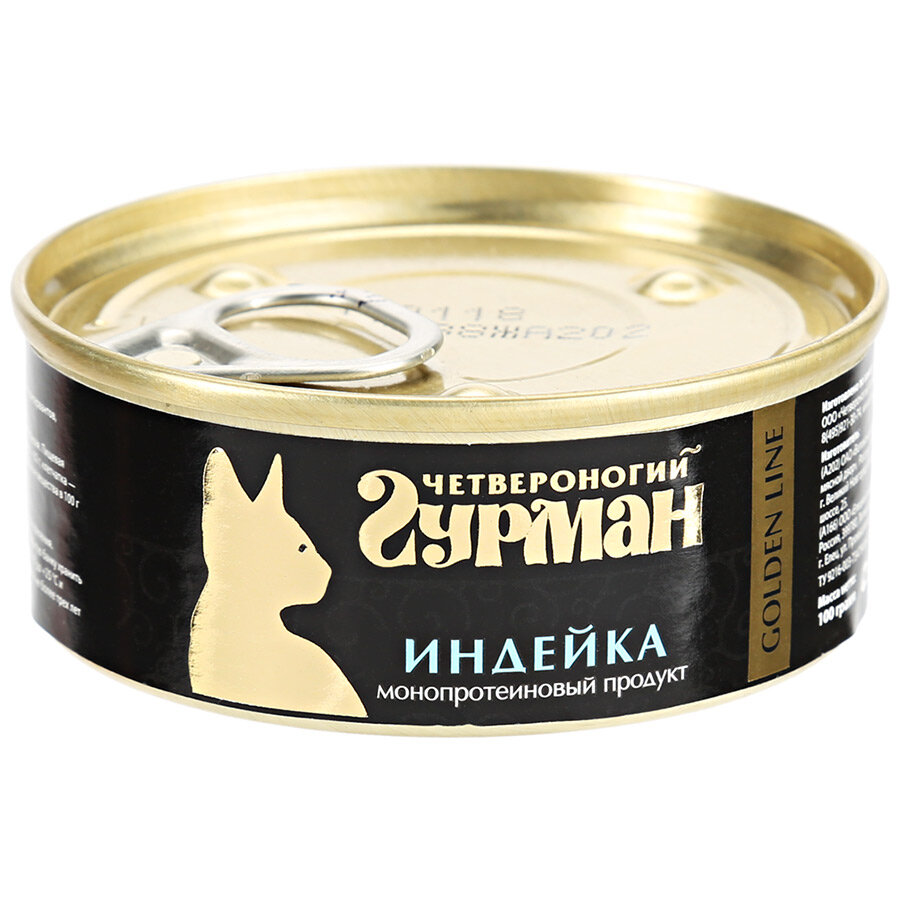 - Влажный корм для кошек Четвероногий гурман производится в России по заказу одноименной компании. Выпускается 4 линейки консервированных кормов для кошек — Golden Line, Мясное ассорти, суфле, паштеты. Основой всех кормов является либо говядина, либо мясо курицы, либо телятина (в зависимости от выбранного типа). В линейке Golden Line, к примеру, присутствует ферментированный рис — натуральный пищевой краситель для мясных продуктов и таурин — незаменимая для кошек аминокислота. А в Мясном ассорти в составе нет злаков, сои, консерваторов, ароматизаторов и ГМО. В основе паштетов также говядина (причем 30%), а вот суфле состоит из субпродуктов, желирующей добавки, аминокислот и красителей. Выпускается корм в баночках по 100, 190 и 240 грамм, приобрести можно в Бетховене от 69 руб. до 113 руб. за баночку (100 грамм) в зависимости от типа корма, в Старой ферме – от 59 руб. до 90 руб.