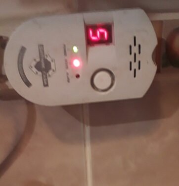 Датчики газа сейчас модная тема. Тем у кого есть газ такой датчик не то чтобы необходим, но не помешает. Если только вы знаете на что такие датчики реагируют и как вам самим реагировать на их срабатывание. Я эксплуатирую датчик газа из комплекта "Охранятор" производства компании "Мастеркит"(это не реклама и не антиреклама просто факт). Но думаю, что написанное относится и к другим относительно дешевым приборам. Так вот на газ он действительно реагирует исправно и система присылает SMS при появлении на дисплее цифр больше тройки. Но еще не разу, кроме тестовых утечек, этот прибор не реагировал непосредственно на природный газ. Хотя СМС мне приходят регулярно, если мы находимся в доме. На фото вверху вы видите срабатывание датчика. Вообще он показывал восьмерку, но пока я настраивал телефон на съемку значение снизилось до пяти. А на фото внизу - причина срабатывания - стакан с водкой под датчиком. Он улавливает пары любых углеводородов и срабатывает.